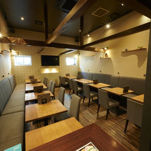 天井が高く、開放感たっぷりの落ち着いた空間◎ご家族やご友人とのお食事はもちろん、テーブルをつなげてのご宴会や貸切利用もOK!20名様以上での貸切も対応可能♪シーンに合わせたコースもご用意しているので、お気軽にご相談ください